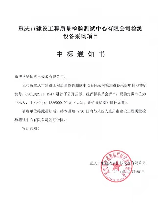 重慶市建設工程質量檢驗測試中心有限公司委托重慶市中基致信招標代理有限公司對我公司檢測設備采購項目(項目號:CQCBJQ2111-194 )進行公開招標采購,現已完成全部采購程序,確認重慶格納迪機電設備有限公司為中標人,中標價為1386000元(壹佰參拾捌萬陸仟佰元整)。