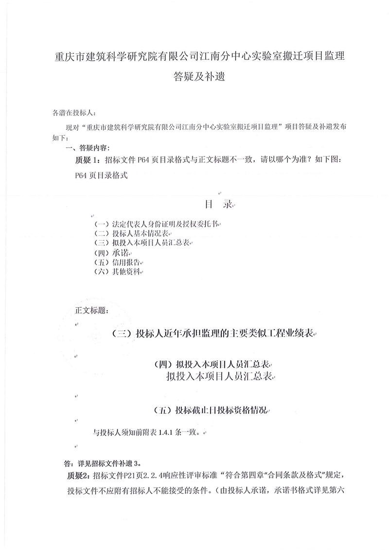 現(xiàn)對(duì)“重慶市建筑科學(xué)研究院有限公司江南分中心實(shí)驗(yàn)室搬遷項(xiàng)目監(jiān)理”項(xiàng)目答疑及補(bǔ)遺發(fā)布如下: