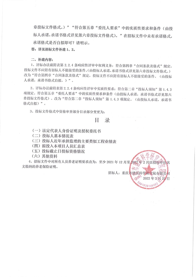 4、招標(biāo)文件中對(duì)所有人員養(yǎng)老證明要求改為:至少2021年12月至2022年2月以投標(biāo)單位名義繳納的養(yǎng)老保險(xiǎn)證明。