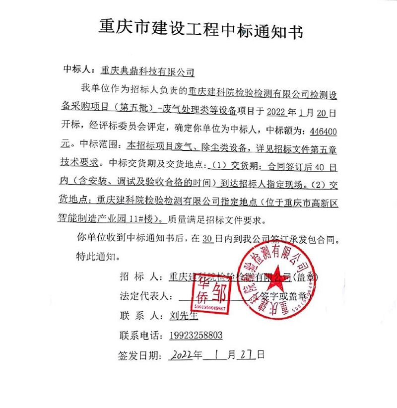 重慶建科院檢驗檢測有限公司委托重慶市工程管理有限公司對我公司檢測設備采購項目(項目號:CQEM-ZB-22002 )重慶建科院檢驗檢測有限公司檢測設備采購項目(第五批)-廢氣處理類等設備進行了公開招標采購,現已完成全部采購程序。確認重慶典鼎科技有限公司為檢測設備采購項目(第五批)-廢氣處理類等設備采購項目中標人,中標價為446400元(大寫:肆拾肆萬陸仟肆佰元整)。