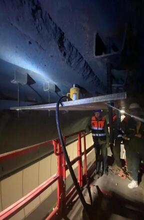該項檢測工作時間緊、任務重,檢測操作難度較大。為了更好地完成檢測工作,公司立即組織相關人員成立專項技術小組并召開技術論證會,隨后及時安排人員開展現場檢測工作,由于該隧道交通通行壓力較大,檢測工作選擇在晚上10點后進行,并協調重慶市渝中區交警支隊進行交通導行,在移動吊車、自卸式起重車等多種特種作業設備的支持下,爭分奪秒,于凌晨3點順利完成了風機吊架承載力檢測工作。
