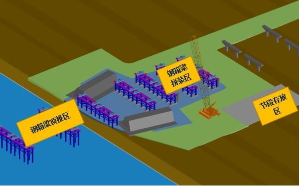 為避免河道水資源污染,確保航道通暢,箱梁采用整節段拼裝、頂推施工工藝。主橋鋼結構現場施工分為鋼箱梁頂推和拱肋吊裝兩部分,鋼箱梁塊段運輸至現場的拼裝支架上組拼成大塊段節段,焊接完成整體后進行頂推施工(鋼箱梁頂推施工期間, 18#、21#墩引橋側高蓋梁暫不施工,主橋側支座墊石正常施工),依次循環,直至鋼箱梁全部頂推完成。拱肋放置于鋼箱梁對應位置一同頂推到位,鋼箱梁整體落梁至頂推臨時支架上,2臺400t履帶吊上橋進行拱肋支架安裝和拱肋安裝。過程中通過整體頂推設備控制程序自動調節,確保設備的協調同步。