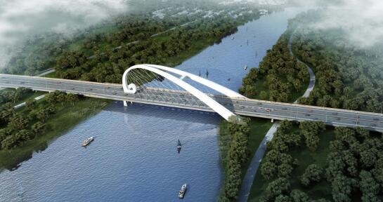 香河縣安石路(運河大道-冀京界段)建設工程是《北京市通州區與河北省三河、大廠、香河三縣市協同發展規劃》的重點工程,也是北運河廊坊段旅游通航的重要組成部分,路線全長3.624公里,采用一級公路兼城市主干路標準建設,道路標準橫斷面采用四幅路形式,雙向六條機動車道,外設非機動車道和人行道,路基寬47米。其中橋梁段(即王家擺大橋)長1060.1米(主橋長256米,引橋長804.1米),采用抱翅型拱梁組合體系,由“Λ”字抱翅外形的空間異形主拱拱圈、拱圈內與主梁連接的斜吊桿和主梁三大主體結構組合而成,主梁半幅為整體鋼箱,半幅之間用橫梁連接,拉索錨固在抱翅拱和主梁的橫梁上,橋面板采用正交異性鋼橋面板。抱翅拱的一端在中央隔離帶處與主梁橫梁連接,下接中墩支座;抱翅拱的另一端成“Λ”形分布于主梁兩側,通過橫梁與主梁連接。造型創意以如意型浪花為構思元素,將運河之水奔流涌動之態和如意的古典華美抽象融合,建成后將成為當地一座極富美感的景觀橋。
