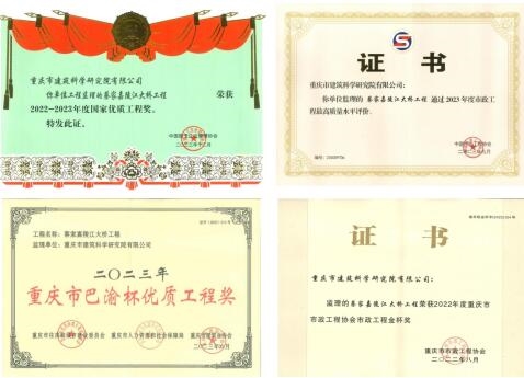 在蔡家嘉陵江大橋修建過程中,項目部創(chuàng)新性監(jiān)理工作,建立健全全壽命質(zhì)量控制體系,采用無人機(jī)進(jìn)行項目智慧管理,利用數(shù)據(jù)信息對施工現(xiàn)場進(jìn)行統(tǒng)一調(diào)配;采用智慧工程——建設(shè)工程協(xié)同管理平臺,將工程項目全生命周期中的信息模型、數(shù)據(jù)信息、管理資料等集合顯示處理,實現(xiàn)全過程協(xié)同管理,顯著提高工作效率;率先實行了二維碼唯一標(biāo)識見證取樣管理制度,實現(xiàn)每一組試件、每一份報告均可溯源。項目獲評國家優(yōu)質(zhì)工程獎、市政工程最高質(zhì)量水平評價(原國家市政工程金獎)、重慶市市政工程金杯獎、三峽杯優(yōu)質(zhì)結(jié)構(gòu)工程獎、巴渝杯優(yōu)質(zhì)結(jié)構(gòu)工程獎、重慶市智慧工地示范項目。