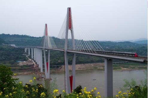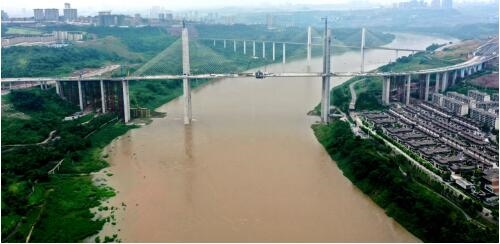 蔡家嘉陵江軌道專用橋為雙線軌道雙索面斜拉橋,全長1250米,由南北引橋和主橋組成,橋跨為連續(xù)梁、雙索面斜拉橋、連續(xù)鋼構(gòu)引橋組成,其中主橋長640米、主跨250米、主橋面距河床距離100米。在設(shè)計時兼顧了功能性、景觀性以及可實施性,最終選擇了與環(huán)境協(xié)調(diào),經(jīng)濟(jì)實惠、施工可實施性強(qiáng)的斜拉橋,由于橋墩高、橋面窄,主橋?qū)挾认鄬τ谄胀ǖ目缃反髽蚋瑯蛏盹@得纖細(xì),在云霧中呈現(xiàn)婀娜多姿的柔美姿態(tài)。