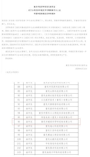 6月16日,從市經濟信息委傳來喜訊,重慶設計集團所屬子企業重慶市建筑科學研究院有限公司獲2024年重慶市專精特新中小企業稱號。